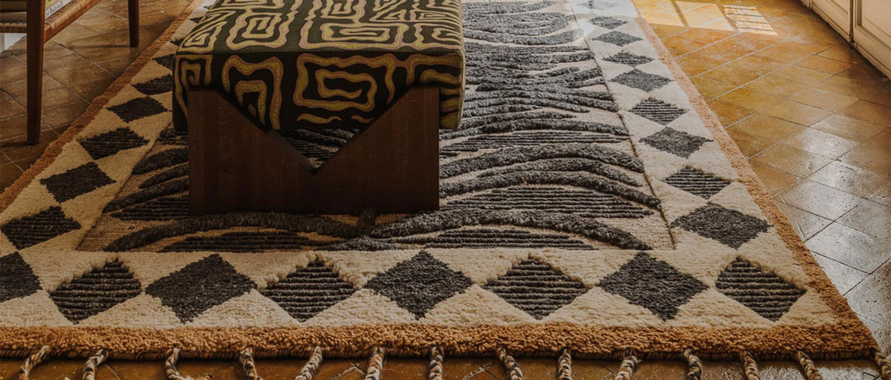 Crafted from 100% handspun wool with a textured surface that enhances its bold, high-contrast pattern.