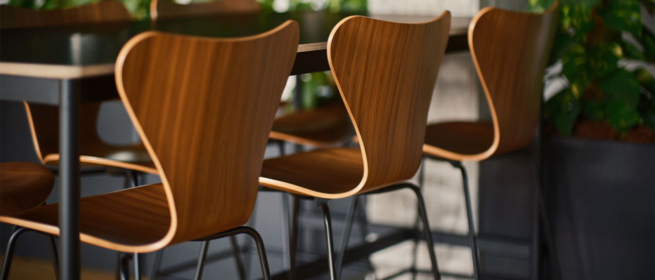 Designed by Arne Jacobsen in 1955, this legendary Danish design continues its legacy in the Series 7™ Barstool by Fritz Hansen. The result is a bar-height seat that blends iconic style with everyday functionality. The curved shell feels sculptural yet comfortable, bringing visual softness to kitchen islands, modern bars, and contemporary dining spaces. The molded veneer construction offers strength and flexibility while keeping the stool remarkably slender and lightweight. Extended legs give the stool its elegant height while a four-sided tubular steel footrest adds stability and comfort. This thoughtful detail preserves the clean geometry that defines Jacobsen’s design language while making long conversations at the counter feel effortless.