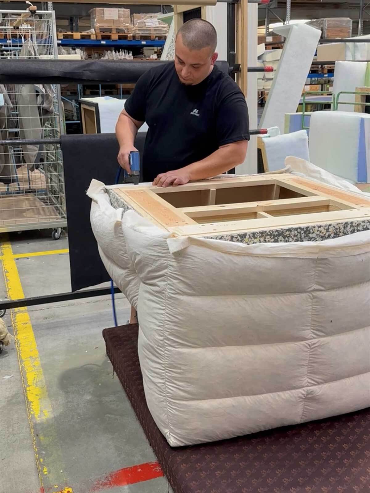 | 2 Next, the wooden pieces are meticulously glued and assembled to form the sturdy frames that serve as the foundation of every Eilersen piece. |